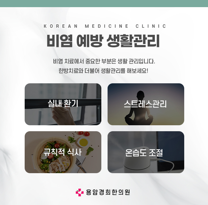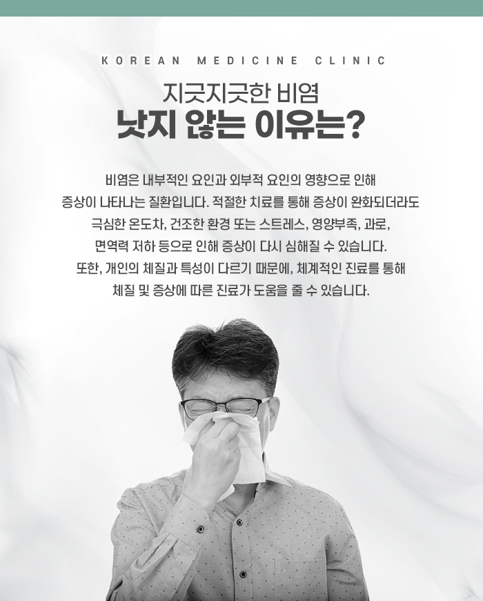 비염은 방치하면 일상생활에 좋지 못한 영향을 끼치고 심한 경우 다른 질환을 야기할 수 있습니다. 따라서 초기에 코에 불편함이 느껴진다면 곧바로 내원해주시기 바랍니다. 본원은 개인의 체질과 상태를 충분한 진료를 통해 섬세하게 파악하고, 개인에게 알맞은 한약과 침 치료 등을 통해 비염에 대해 긍정적인 변화를 이끌어내도록 노력하고 있습니다.