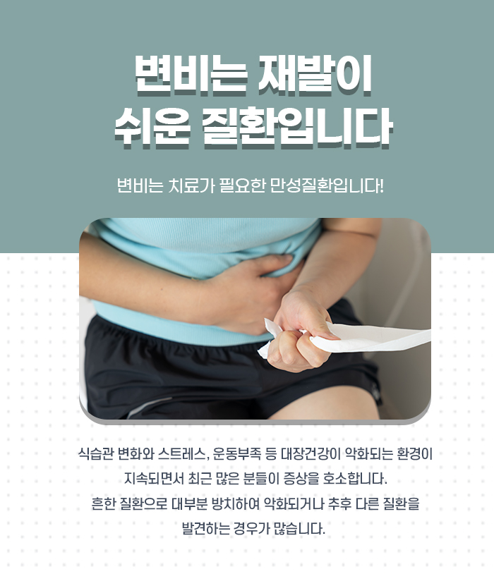 대장항문 질환 중에서도 20대부터 80대 노인까지 남녀노소 고생하는 질환이 만성 변비입니다. 동남지구변비는 대장의 전도 기능 실조로 분변이 장내에 오래 머물러 있고 수분이 과다하게 흡수돼 변질이 굳어서 배출이 어려운 경우를 말합니다. 연령이 증가할수록 그 빈도가 증가하고 남자보다 여자에게 흔하게 발생합니다. 전립선염이나 방광질환을 앓거나 요실금이 있는 중장년층도 수분 섭취가 줄어 변비로 고생하는 분이 많습니다. 변비는 배변 횟수가 1주에 2회 이하로 적고 배변 시 무리한 힘이 필요한 경우, 배변 시 변이 너무 단단하게 나오는 경우, 또 변을 봐도 시원하지 않고 잔변감이 있으면 의심할 수 있습니다.
