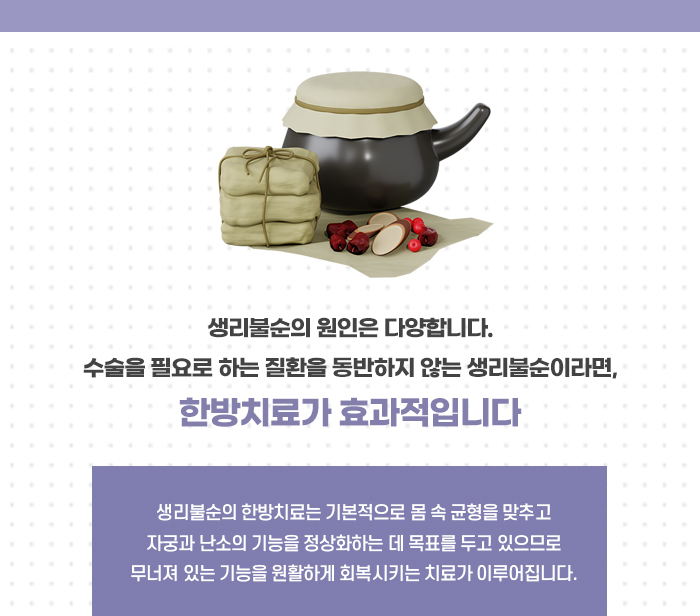 증상과 원인에 맞는 금천동생리불순치료가 중요한데, 스트레스나 불규칙한 식습관 등의 영향으로 인한 호르몬 불균형에 의한 경우나 다낭성난소증후군 등의 질환에 의한 경우 등에 맞게 치료가 이뤄져야 합니다. 관련 한약처방 등으로 자궁과 난소 신장 간 등 장부의 기능을 강화시키고 호르몬의 불균형을 바로잡는 것이 중요합니다. 이러한 원인치료 시엔 개인 체질에 따른 처방이 가능해야 합니단 개인에 따라 골반 및 하복부 기혈순환이나 어혈과 담음 등 체내 노폐물을 제거하는 치료도 요구됩니다. 환자의 생활이나 식습관을 파악하고 개선이 필요한 부분을 찾아내 필요한 생활관리법지도도 필요합니다.