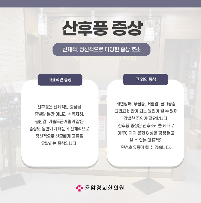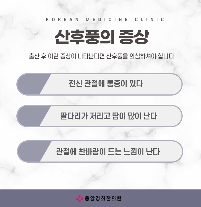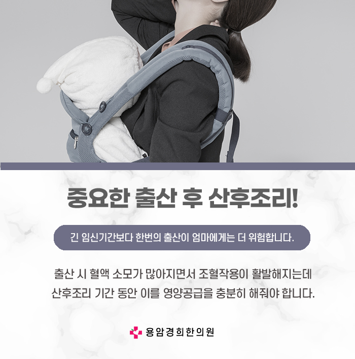 만약 산후조리 기간동안 제대로 된 회복이 안 되었을 경우, 산후풍 증상이 발생하기 쉽습니다. 대체로 몸이 무겁고 붓는 현상, 관절통과 근육통, 소화불량, 불면증, 우울증, 만성 피로감 등을 경험하게 됩니다. 특히 임신 중에는 넓어진 골반과 불러온 배로 인해 허리통증에 시달리게 되는데, 이 무게를 지탱하면서 무릎통증도 유발되기 쉽습니다. 출산 후 이러한 근골격계 통증 또한 회복기간이 반드시 필요합니다. 늘어난 자궁이 회복되는 과정에서 너무 강한 수축이 일어날 경우 출혈이 평균보다 심해질 수 있습니다. 또한 약한 수축이 진행되면 출혈기간이 보다 길어질 수 있고, 훗배앓이에 노출되기 쉽습니다. 따라서 동남지구산후풍한의원의 도움을 받아 자궁의 건강상태를 회복하는 것이 가장 중요하며 필요한 영양공급, 자궁 근육강화를 돕는 스트레칭이 병행되면 좋습니다.