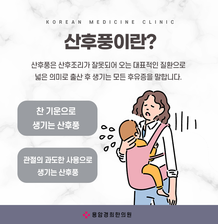 산후풍은 출산 후 여성의 신체와 정신적인 회복 과정에서 발생할 수 있는 다양한 증상으로, 기와 혈의 순환에 문제가 생기거나 외부의 자극에 취약해지면서 발생합니다. 산후풍의 증상은 관절통, 피로감, 소화불량 등 다양하게 나타날 수 있으며, 한방에서는 이를 기혈 보충과 풍습 제거를 통해 치료합니다.