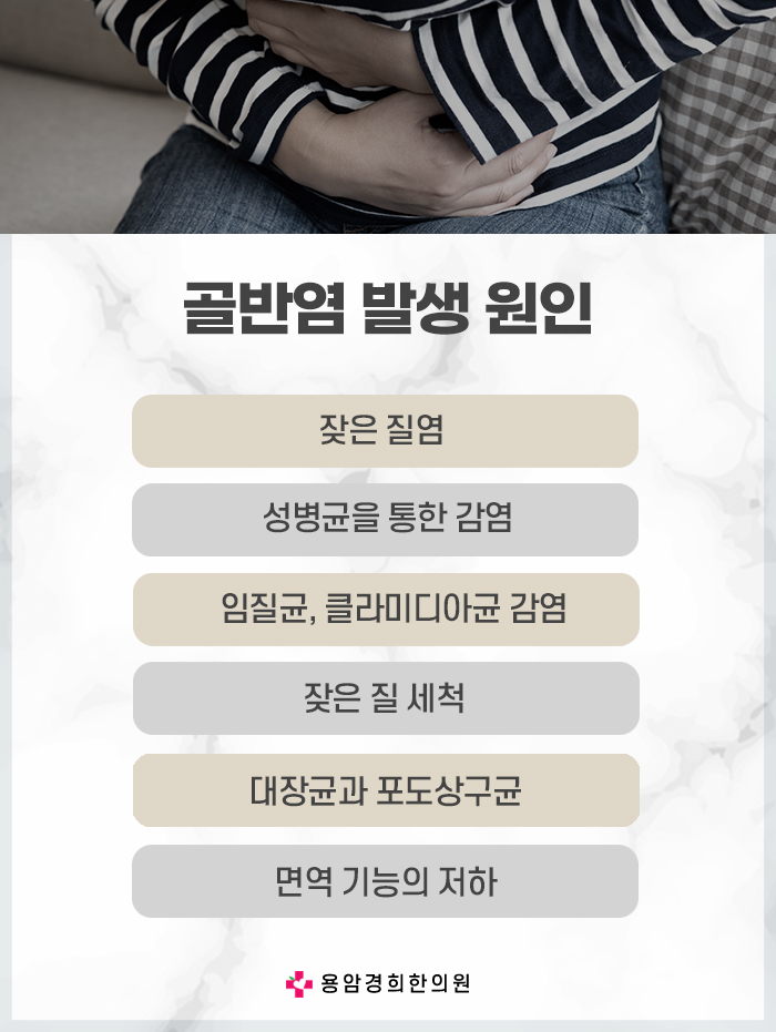 출산 후에는 자궁과 자궁경부가 치유되는 동안 세균이 침투하여 금천동골반염을 일으킬 수 있습니다. 특히 분만 후 위생적인 관리가 제대로 이루어지지 않으면 감염이 발생할 수 있습니다. 만약 면역 시스템이 약화되어 있다면 세균 감염이 쉽게 발생할 수 있습니다. 당뇨병이나 면역질환이 있는 경우 골반염에 걸릴 위험이 증가할 수 있습니다. 또한, 과도한 스트레스나 불규칙한 생활습관 역시 면역력을 저하시킬 수 있습니다. 골반염의 증상은 가벼운 불편감에서부터 심각한 통증과 고열을 동반할 수 있습니다. 증상의 정도는 감염의 범위와 정도에 따라 다를 수 있습니다.