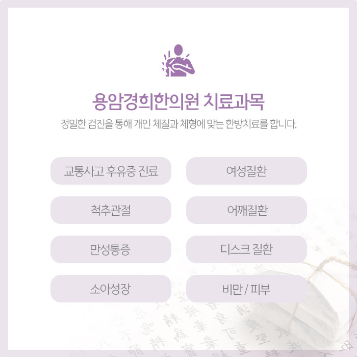 방서동교통사고한의원에서는 통합적인 한방치료로 편타성 손상과 어혈로 발생하는 다양한 교통사고후유증 회복을 도와드립니다. 그리고 신체 통증, 체형교정, 한방 다이어트, 소아성장, 디스크, 여성질환 등 진료합니다. 과잉진료 없이 환자분에게 꼭 필요한 치료만 하며 검증된 재료와 방법으로 정직한 진료를 약속드립니다.