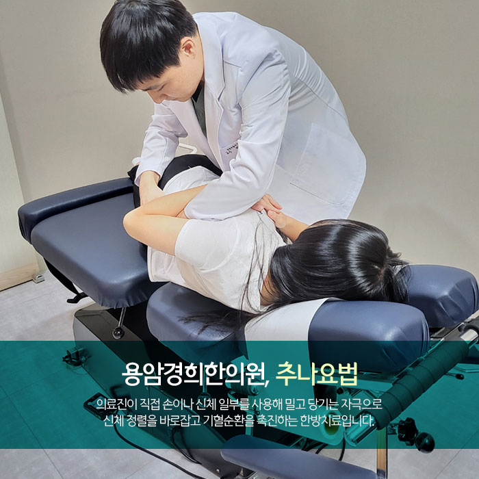 추나요법은 분평동일요일한의원 의료진이 손이나 신체, 소도구를 활용해 환자분 신체를 밀고 당기는 자극으로 정렬을 바로잡고 어혈을 제거해 기혈순환을 촉진하는 한방치료입니다. 기혈순환을 촉진해 염증과 통증을 완화하여 류마티스 관절염으로 인한 증상 개선을 돕습니다.