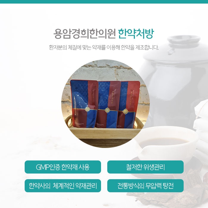 개인 체질에 맞는 약재를 구성해 조제하는 한약은 손상된 관절주변 주변 어혈을 제거하고 기혈순환을 촉진해 염증과 통증을 완화합니다. 또한 건강한 혈액을 생성해 면역력 향상과 전반적인 건강증진을 돕습니다. 본원에서 처방드리는 한약은 GMP인증을 받은 정품 한약재와 정수된 물, 철저한 위생과정을 거쳐 원내에서 직접 제조합니다.