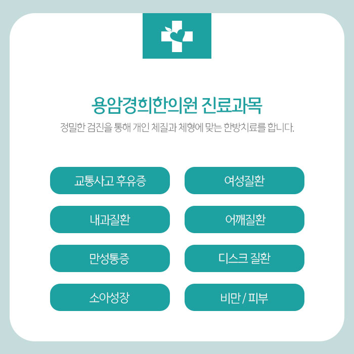분평동일요일한의원에서는 통합적인 한방치료로 류마티스 관절염 회복을 도와드립니다. 그리고 신체통증, 체형교정, 한방다이어트, 교통사고후유증, 내과질환, 여성질환, 디스크, 소아성장 등 진료하며 과잉진료 없이 검증된 재료와 방법으로 정직한 진료를 약속드립니다.