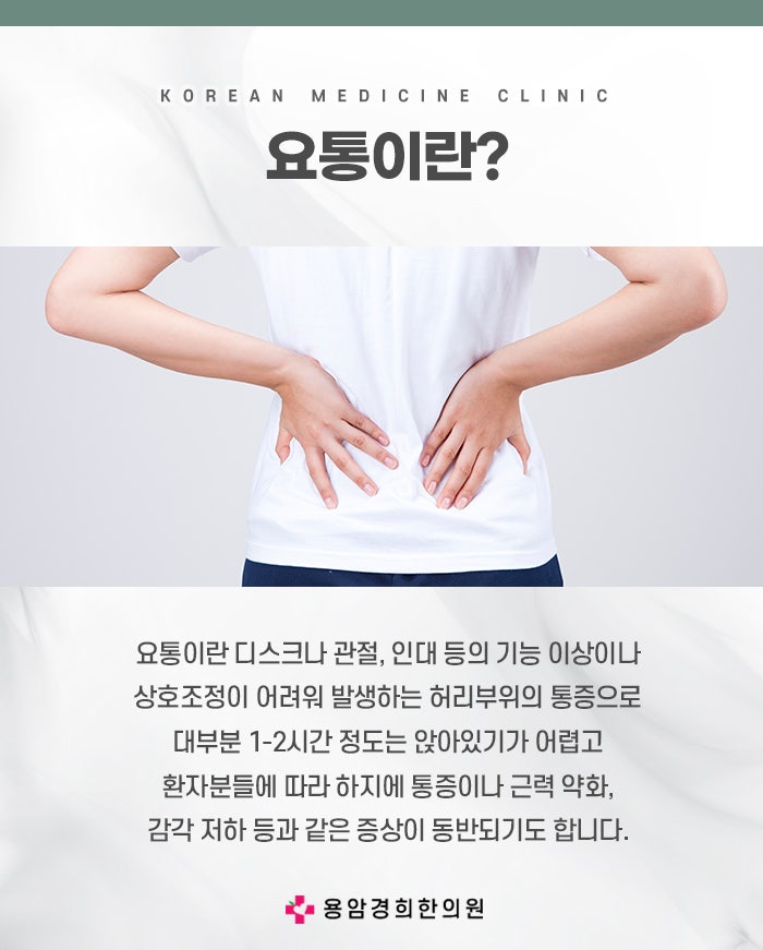 골반이 틀어지거나 체형이 불균형 한경우 한쪽 다리에 무게를 싣거나 다리를 꼬고 앉는 습관 등으로 골반이 틀어지면 허리에 부담이 가중되며 요통이 반복적으로 생길 수 있습니다. 체중이 많이 나가거나 복부 비만이 있을 경우 허리에 부담이 커지고, 허리 주변 근육이 약할 경우 쉽게 통증이 생깁니다. 요통의 증상은 원인에 따라 다양하게 나타납니다. 허리를 구부릴 때나 앉을 때 통증이 심해지고, 허리에서 엉치, 허벅지, 다리까지 방사통이 이어지게 됩니다. 오래 서있거나 걷는 것이 어렵고, 아침에 일어날 때 허리가 뻣뻣하거나 통증이 발생할 수 있어 이런 증상이 나타난다면 용암동요통한의원에 내원하시는 것이 좋습니다.