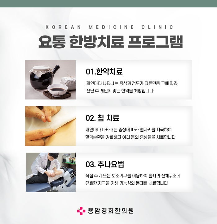 한의학에서는 요통을 단순히 ‘근육통’으로 보지 않고, 신체 내부의 불균형 또는 장부 기능 저하, 기혈의 정체, 외부의 풍한습사 등 다양한 원인으로 파악합니다. 한약은 통증 개선 뿐만 아니라 허리 근육과 인대, 뼈를 강화해줍니다. 또한, 기혈을 보충하고 어혈을 제거하여 통증의 원인을 다스리는 치료가 가능합니다. 침은 통증을 유발하는 경혈을 자극해 기혈순환을 원활하게 하고, 근육의 긴장을 풀어주는 데 도움이 됩니다. 특히, 급성 통증이나 허리 삐끗함, 디스크 초기 증상에 즉각적인 도움을 줄 수 있습니다. 추나요법은 한의사가 손으로 근육, 관절, 척추를 교정하여 틀어진 골반이나 척추의 정렬을 회복시키는 치료법입니다.