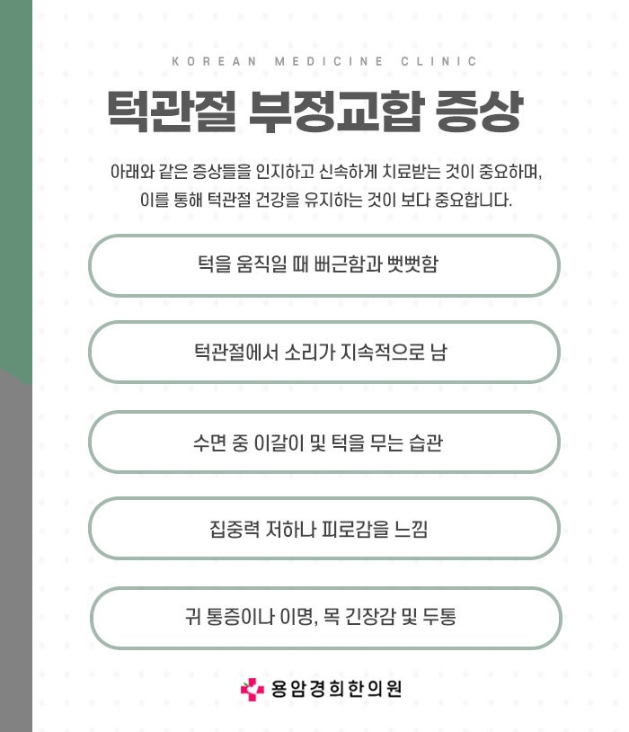 교통사고나 운동 중 충격으로 인해 턱에 물리적 손상이 발생할 수 있습니다. 이로 인해 턱관절에 염증이 생기거나 디스크가 밀려서 문제가 생길 수 있습니다. 부정교합은 윗니와 아랫니의 맞물림이 제대로 되지 않는 상태입니다. 이런 문제가 있으면 음식을 씹을 때 턱에 과도한 힘이 가해져 턱관절에 부담을 줄 수 있습니다. 나이가 들면서 관절의 연골이 닳아 퇴행성 변화가 일어날 수 있습니다. 이로 인해 턱관절 기능에 문제가 생기기도 하기에 금천동관절교정한의원의 치료를 받으시면 좋습니다. 가장 흔한 증상은 턱 부위나 턱 주위의 통증입니다. 특히 입을 크게 벌리거나 음식을 씹을 때 통증이 심해질 수 있습니다. 턱을 움직일 때 딱딱하거나 클릭 소리가 나는 경우가 많습니다. 이는 턱관절 디스크가 제자리에서 벗어나면서 발생하는 현상입니다.