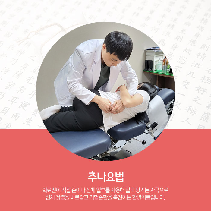 담당 의료진이 손과 신체, 소도구 등을 활용해 환자분 신체를 밀고당기는 자극으로 정렬을 바르게 하고 하복부 주변 어혈 제거해 방광환경을 개선하는 한방치료입니다. 신체회복을 돕는 추나요법은 개인마다 다른 체형을 고려해 문제가 되는 정확한 부분을 자극해야 하므로 의료진의 정밀한 기술이 요구됩니다.