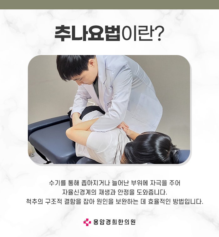 뜸 치료는 혈액 순환을 개선하고, 염증을 개선하는 데 도움을 줍니다. 경혈에 뜸을 떠서 자극을 주면, 기혈 순환이 원활하게 되고, 척추 부위의 경직된 근육이 풀리면서 통증이 감소할 수 있습니다. 뜸 치료는 허리 통증이나 목 통증에 도움이 되며 차가운 기운을 제거하고 온기를 공급하여 치료를 돕습니다. 추나요법은 척추를 직접적으로 교정하고 근육과 관절을 풀어주는 치료법입니다. 추나요법을 통해 척추의 균형을 맞추고, 관절의 가동성을 개선할 수 있습니다. 특히 디스크 탈출증이나 척추관 협착증과 같은 문제에서 척추의 정렬을 바로잡는 데 유효하며, 신경 압박을 개선하고, 혈액 순환을 촉진시켜 줍니다