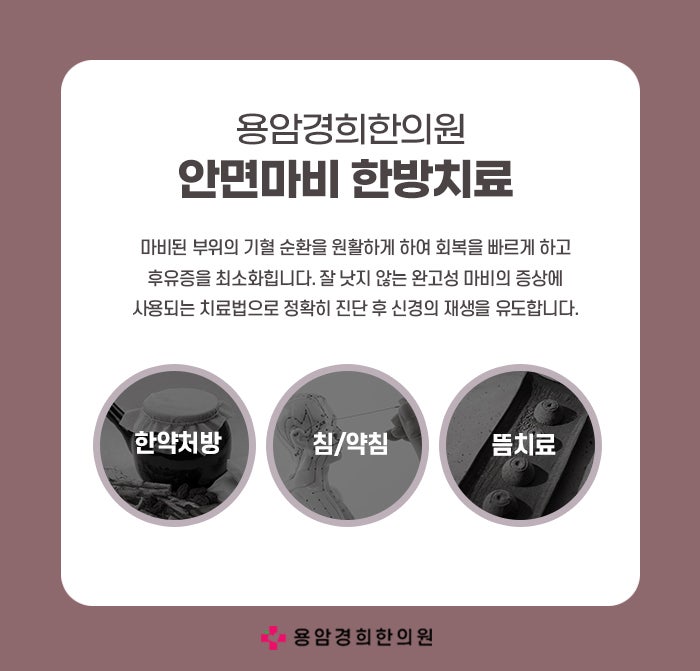 한의학에서는 방서동안면마비를 빠르게 회복시키기 위해 초기 치료가 매우 중요하다고 봅니다. 특히 발병 2주 이내에 집중적인 치료를 받을 경우 완치율이 매우 높아집니다. 침 치료는 경혈을 자극하여 막힌 기혈 순환을 회복하는 데 도움을 줍니다. 마비된 근육의 움직임을 빠르게 회복시키고, 신경재생 촉진합니다. 한약은 몸 안의 풍사를 제거하고, 기혈을 보강하는 처방이 진행되며, 면역력 강화와 신경 회복 촉진에 도움을 줍니다. 뜸은 안면 혈류를 따뜻하게 순환시켜 근육 이완 및 재생 유도하며, 면역 체계 강화, 체력 회복에 도움을 줍니다. 안면마비는 재발과 후유증 방지를 위해 꾸준한 관리가 중요합니다.