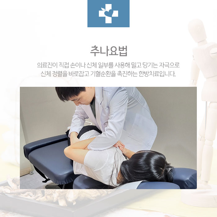 방서동한의원에서는 편두통 원인을 파악하고 체질에 따라 한약, 약침, 추나요법, 부항, 뜸 등의 복합적인 한방치료를 적용합니다. 어혈때문에 혈류순환이 원활하게 이뤄지지 않아 편두통이 생기는 경우 적용하는 추나요법은 담당 의료진이 손과 신체, 소도구를 활용해 밀고 당기는 자극으로 환자분의 경추 정렬을 바로잡고 과한 긴장을 줄여 두통을 완화합니다.