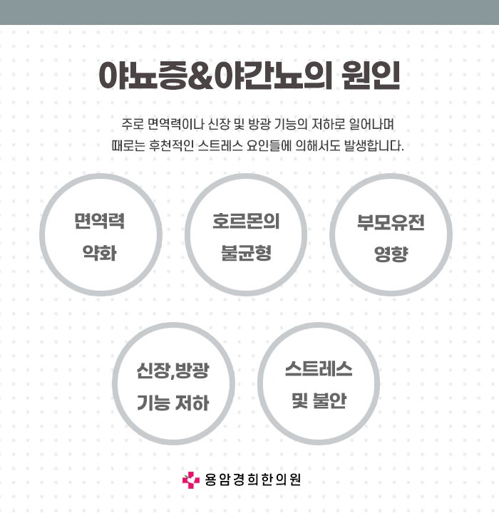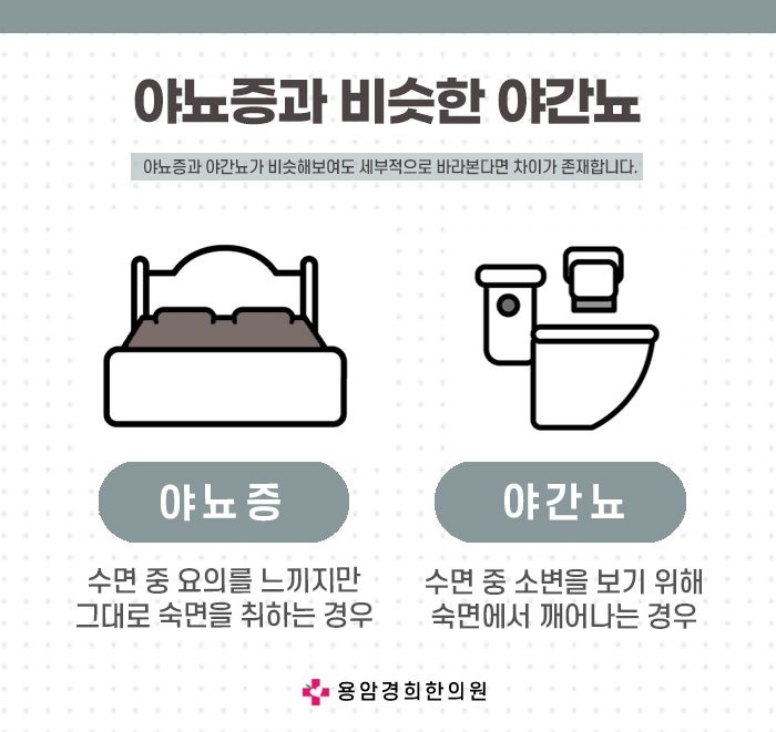수면 중 1~3회 이상 소변을 보기 위해 잠에서 깨거나, 소변량이 많거나 적은데도 불구하고 소변이 자주 마렵거나 소변을 본 후 다시 잠들기 어렵거나 낮 시간보다 밤에 소변 빈도가 높은 경우, 그리고 수면 부족으로 인한 피로감, 집중력 저하, 두통이 발생하면 야간뇨를 의심해볼 수 있다고 동남지구야간뇨한의원에서는 말합니다. 그에 더해 중장년층의 경우 낙상 위험까지 증가할 수 있어 주의해야 합니다. 야간뇨는 한 가지 질병의 결과가 아니라, 다양한 생리적 또는 병리적 요인이 복합적으로 작용하여 나타나는 증상입니다. 노화가 진행되면 방광의 탄력성과 수축력이 떨어져 저장 능력이 감소합니다. 이로 인해 방광이 자주 비워지려 하며, 특히 밤에 빈뇨가 심해질 수 있습니다.