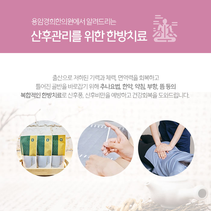 그래서 한방치료를 통해 골반강과 자궁의 원활한 순환을 돕고 산모의 기혈 회복을 해주어 산후풍을 예방하고 여성질환이 생기지 않도록 합니다. 이러한 한방치료와 함께 개인적인 건강관리가 병행된다면 보다 원활한 회복에 큰 도움이 됩니다.