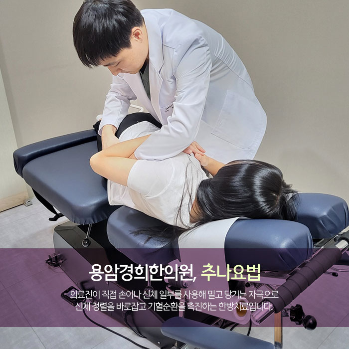 추나요법은 의료진이 손, 신체, 소도구를 활용해 밀고 당기는 자극으로 사고 충격으로 틀어진 신체 정렬을 바로잡고 어혈을 제거해 기혈순환을 회복하는 한방치료입니다. 교통사고 후유증 뿐 아니라 관절염, 척추질환 등 치료에 활용되며 체형교정과 재활치료에도 적용할 수 있습니다.