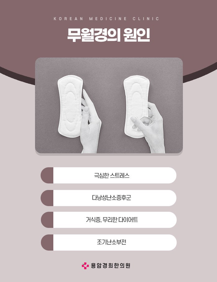대표적으로는 임신, 수유, 폐경 등이 생리적으로 나타나는 무월경이 있고, 병리적인 무월경으로는 스트레스, 체중 급감, 과도한 운동, 다낭성난소증후군, 갑상선 기능 이상, 고프로락틴혈증, 조기 난소 부전, 자궁내막 유착증등이 있습니다. 또한 장기간 피임약이나 호르몬 치료를 받은 경우, 또는 심리적 충격이나 스트레스 등도 무월경을 유발할 수 있습니다. 방서동무월경 환자는 단순히 생리를 하지 않는 것 외에도 다양한 증상을 동반하게 됩니다. 여성 호르몬 분비의 이상으로 인해 여드름, 체중 증가, 음모나 체모 증가 등의 남성화 증상이 나타나거나, 유즙 분비, 불면증, 우울감, 집중력 저하 등의 정신적 증상이 동반될 수 있습니다.