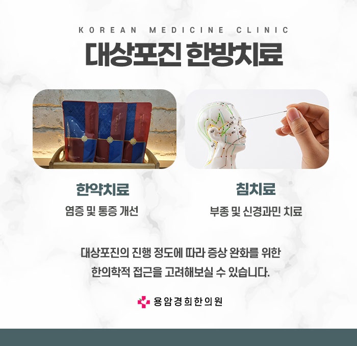 한약은 기혈의 부족과 내부의 염증을 다루는 데 중요한 역할을 합니다. 대상포진에 사용되는 한약은 통증을 개선하고 염증을 감소시키며, 체내의 기와 혈을 보충하여 면역력을 강화하는 방향으로 처방됩니다. 침은 침과 한약의 효능을 결합하여 염증을 다스리고, 통증을 경감시키는 데 사용됩니다. 약침은 금천동대상포진치료에 있어 도움을 주는 방법으로, 피부의 염증을 직접적으로 치료하고, 신경염증을 감소하는 데 도움이 됩니다. 약침은 한약의 성분을 침을 통해 직접 경혈에 주입하는 방식으로 치료를 제공합니다. 뜸 치료는 체온을 높여 기와 혈의 흐름을 원활하게 하고, 염증을 감소하는 데 도움을 줍니다. 뜸은 기운의 차가움을 개선하고, 신경을 안정시키는 데 도움이 되는 치료법으로, 대상포진의 통증을 감소시키는 데 사용됩니다.