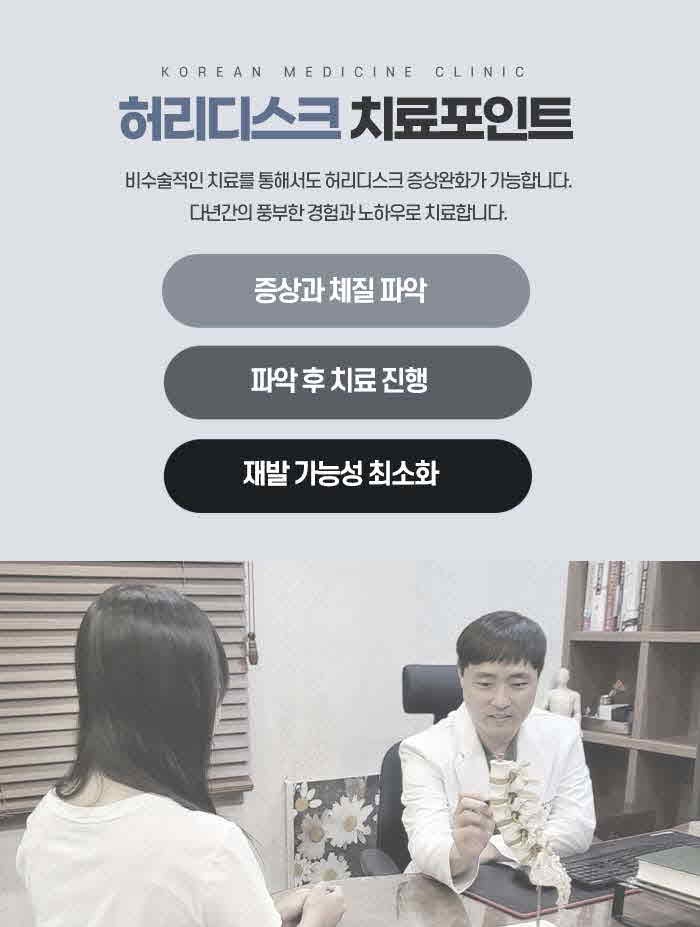 수술적 치료가 필요한 경우도 있으나, 대부분의 허리디스크는 한방치료와 생활관리로 증상이 개선될 수 있습니다. 결론적으로 허리디스크는 잘못된 생활습관과 자세, 노화 등으로 인해 발생하는 흔한 질환이지만, 꾸준한 한방치료와 올바른 생활습관 개선으로 충분히 관리하고 개선할 수 있습니다. 통증에 지치고 힘든 순간에도 자신을 사랑하는 마음을 잃지 말고, 건강한 허리를 위한 작은 습관부터 실천해 나간다면 분명 밝고 활기찬 삶을 이어갈 수 있을 것입니다. 당신의 허리가 편안해지고, 매일을 건강하고 행복하게 보내길 진심으로 응원합니다. 언제나 당신의 건강과 행복을 함께 기원합니다.