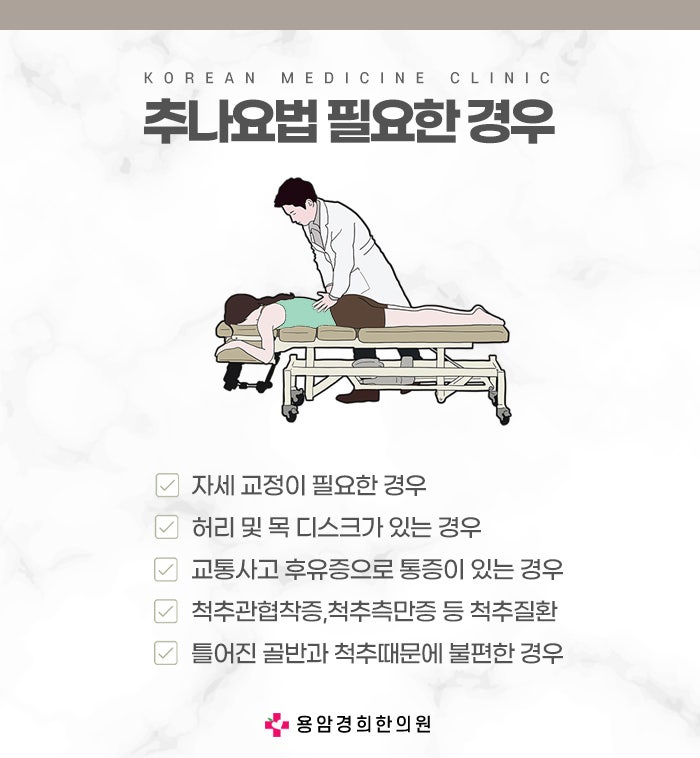 금천동추나요법한의원 추나요법은 특히 근골격계 질환에 도움이 되는 치료법으로 알려져 있습니다. 척추나 관절의 문제로 인한 통증을 개선하는 데 도움을 줍니다. 대표적인 질환으로는 척추 측만증, 척추 디스크, 경추 질환, 요추 질환, 어깨 통증, 무릎 통증 등이 있습니다. 척추 측만증이나 디스크 문제로 인해 척추가 비정상적으로 휘거나, 신경이 압박을 받게 되면 극심한 통증을 유발할 수 있습니다. 이 경우 추나요법은 척추를 올바른 위치로 교정하고, 신경 압박을 해소하여 통증을 감소시키는 데 도움을 줍니다. 또한, 추나요법은 디스크의 문제를 개선하는 데에도 도움이 됩니다. 디스크가 탈출하거나 튀어나와 신경을 압박할 때, 추나요법은 그 위치를 바로잡아 통증을 경감시키고, 염증을 줄여줍니다.
