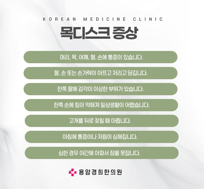 목디스크는 일상생활에 큰 영향을 미치는 질환입니다. 하지만 적절한 치료와 관리로 증상을 완화하고, 회복할 수 있습니다. 특히 한방 치료는 목디스크의 통증을 감소하고, 기혈의 균형을 맞추는 데 도움을 주는 치료법으로, 많은 환자들이 큰 도움이 되었다고 보고하고 있습니다. 목디스크로 인한 불편함과 고통이 길어지지 않도록 초기에 치료를 시작하는 것이 중요하며, 꾸준한 관리와 예방을 통해 건강한 목을 유지하는 것이 필요합니다.
