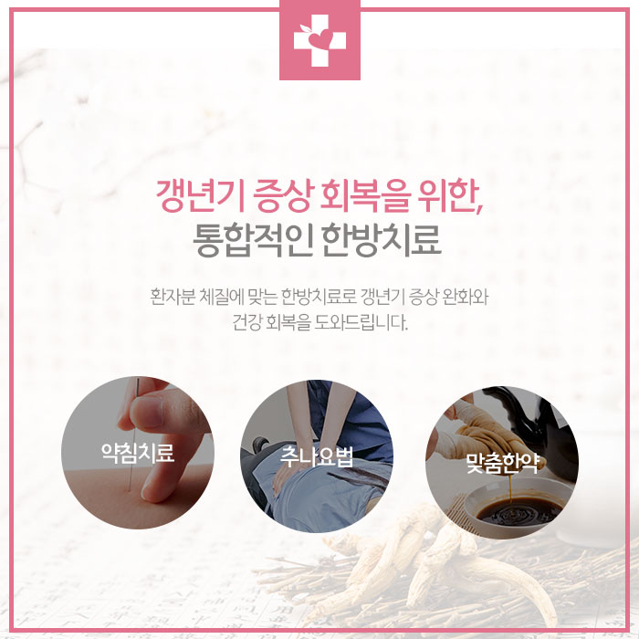 이런 경우 한방치료를 통하여 자율신경계를 안정시켜주고 신체 내부의 혈액순환과 호르몬대사를 원활히 해주는 것이 좋습니다. 갱년기에 발생하는 증상개선과 건강한 체중감량을 위해 추나요법, 한약, 약침, 부항, 뜸 등의 한방치료 도움을 받을 수 있습니다.