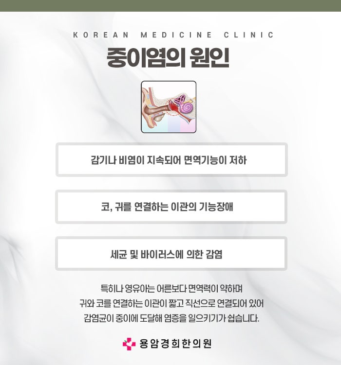 금천동중이염은 흔히 감기나 상기도 감염과 동반되어 나타나며, 바이러스나 세균이 이관을 통해 중이로 침입하면서 염증을 유발하게 됩니다. 중이염의 주요 원인은 감기와 같은 상기도 감염입니다. 코와 인후에 감염이 생기면 점막이 부어오르고 이관이 막혀 중이 내에 압력이 증가하며, 이로 인해 중이 내의 공기 흐름이 차단되고 세균이나 바이러스가 번식하게 됩니다. 이로 인해 염증이 생기고 고름이 차거나 삼출물이 고이며, 통증과 발열 등의 증상이 나타납니다. 특히 이관이 짧고 수평에 가까운 구조를 가진 유아의 경우 세균이나 바이러스가 쉽게 중이로 이동하게 되어 중이염이 더 자주 발생하게 됩니다. 또한 알레르기 비염, 부비동염, 아데노이드 비대, 수영 후 귀에 물이 들어간 경우, 면역력 저하, 급격한 기온 변화, 환경오염 등도 중이염의 유발 요인이 될 수 있으며, 수유 자세나 젖병을 물고 자는 습관 등도 유아 중이염의 발병률을 높이는 원인으로 알려져 있습니다.