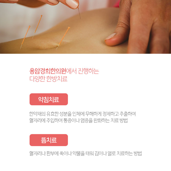 한약 및 생약성분에서 추출해 정제한 약물을 소량 주입하는 약침치료는 방광주변 어혈을 제거하고 기혈순환을 촉진해 염증과 통증을 완화합니다. 주입되는 약물에 따라 봉침 등 여러 방법이 있으며 사용되는 약물에 대한 알레르기 반응과 체질을 고려해 진행합니다.