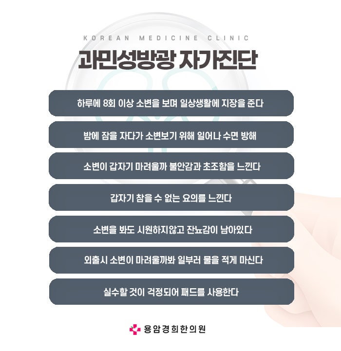 과민성방광은 소변이 실제로 방광에 충분히 차지 않았음에도 불구하고 갑작스럽고 강한 요의를 느껴 화장실에 자주 가야 하며, 때로는 소변을 참지 못해 소변이 새는 요실금 증상까지 동반되는 질환입니다. 이 질환은 구조적인 이상이 없는 상태에서 기능적인 문제로 인해 방광이 비정상적으로 예민하게 반응하는 것이 특징입니다. 과민성방광은 삶의 질을 현저히 떨어뜨리는 질환으로, 사람들과의 사회적 관계를 피하게 만들고, 수면의 질을 저하시켜 피로를 누적시키며, 정신적 스트레스까지 유발할 수 있는 만성 질환이라고 용암동과민성방광한의원에서는 말합니다. 대표적인 증상으로는 하루에 8회 이상 소변을 보는 빈뇨, 강한 요의를 느끼는 절박뇨, 화장실을 가기 전에 소변이 새는 절박성 요실금, 그리고 야간에 1회 이상 소변을 보기 위해 잠에서 깨는 야간뇨 등이 있습니다.
