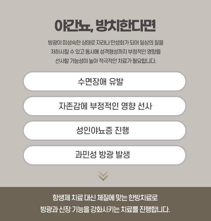야간뇨는 단순히 밤에 소변을 자주 보는 증상 그 이상입니다. 깊은 잠을 방해하고 낮 시간의 활동 능력을 떨어뜨리며, 반복되면 삶의 질에 큰 영향을 미치는 문제이기도 합니다. 하지만 그 원인을 잘 이해하고, 몸의 신호를 섬세하게 읽어가며 치료와 관리를 병행한다면 충분히 호전될 수 있습니다. 당신의 몸은 그동안 많은 일을 해내고 수많은 자극과 변화 속에서도 묵묵히 자리를 지켜왔습니다. 야간뇨로 인해 힘든 밤을 보내고 있다면, 그건 당신의 몸이 도움을 필요로 하고 있다는 작은 외침일 수 있습니다. 지금부터라도 조금 더 내 몸을 들여다보고, 따뜻한 관심과 꾸준한 관리를 해보세요.