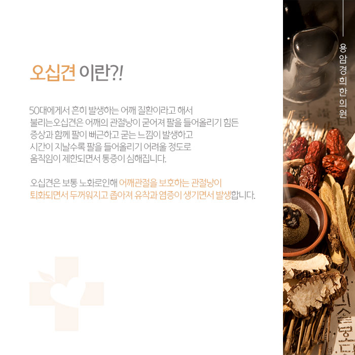 동결견, 유착성 관절낭염 등으로도 불리는 오십견은 반복적인 어깨 사용, 노화, 또는 외상 이후 어깨 관절을 둘러싼 조직에서 염증과 유착이 발생하여 통증과 운동 제한을 일으키는 질환입니다. 관절낭과 주변 근육, 인대가 뻣뻣해지면서 어깨를 움직이는 범위가 점점 줄어드는 것이 특징입니다.