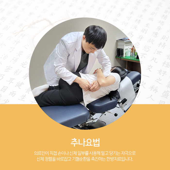 이러한 추나요법은 어깨통증 원인과 동반되는 문제, 체형을 고려해 문제가 되는 정확한 부분에 적당한 자극이 가해져야 하므로 의료진의 정밀한 기술과 해부학적 지식이 요구됩니다. 그러므로 진행하는 의료진에 따라 회복되는 결과가 달라질 수 있어 경험과 노하우가 많은 의료진을 통해 진행하는 것이 좋습니다.
