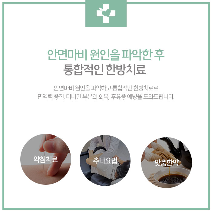 이와 같이 안면신경마비는 발생 후 빠른 시일 내 회복되지 않으면 평생 표정이 부자연스러운 등의 후유증을 남길 수 있어 빠른 대응이 중요합니다. 안면마비 증상을 개선하고 면역력 증진을 위해 추나요법, 한약, 약침, 부항, 뜸 등의 한방치료 도움을 받아볼 수 있습니다.