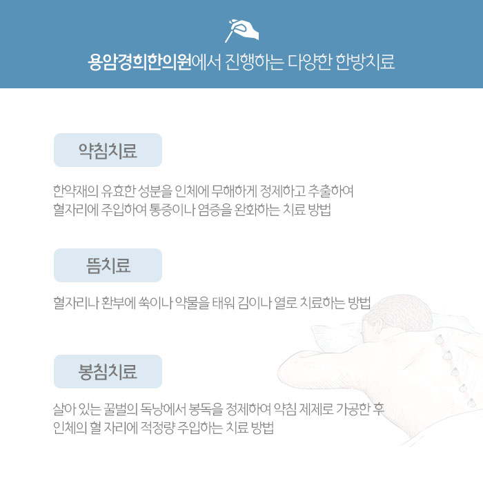 한약성분에서 추출해 정제한 약물을 주입하는 금천동주말진료한의원 약침치료는 어깨 관절낭 주변 손상된 조직의 재생을 돕고 염증과 통증을 빠르게 완화합니다. 주입되는 약물에 따라 봉침 등 여러 방법이 있습니다. 그리고 알레르기 반응과 체질을 고려해 적용하는 한방치료입니다.