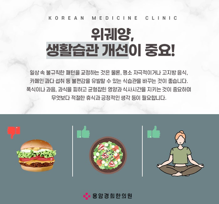 생활 관리법은 위궤양 치료와 재발 방지에 매우 중요합니다. 규칙적인 식사와 적절한 식사량 유지, 과식과 야식 피하기가 필요합니다. 자극적인 음식, 매운 음식, 카페인, 알코올, 흡연 등은 위 점막을 자극하므로 섭취를 제한하는 것이 좋습니다. 스트레스 관리와 충분한 수면, 규칙적인 운동은 위장 기능과 자율신경 균형을 유지하는 데 도움이 됩니다. 또한 약물 복용 시 위 점막에 부담을 줄 수 있는 NSAIDs 등의 장기 사용은 전문의와 상의하여 조절해야 하며, 위장 건강을 위한 수분 섭취와 소화에 부담을 주지 않는 식사 습관을 유지하는 것이 중요합니다. 위궤양 회복 시에는 부드러운 음식과 소화가 잘 되는 음식을 중심으로 식단을 구성하고, 천천히 잘 씹어 먹는 습관도 점막 보호에 도움을 준다고 동남지구위궤양한의원에서는 말합니다.
