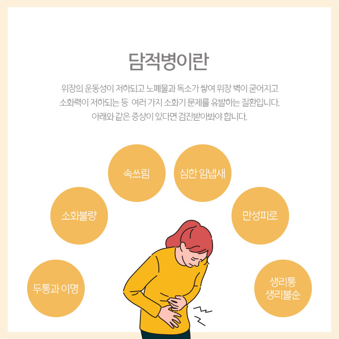 그리고 시간이 지나 담적이 부패하면서 형성되는 담 독소가 혈관과 림프관을 통해 전신으로 확산되면 만성피로 증상, 두통, 어지러움증, 불면증, 우울증, 수족냉증, 이명, 생리통, 생리불순 등 다양한 증상과 질환까지도 이어질 수 있어 주의해야 합니다