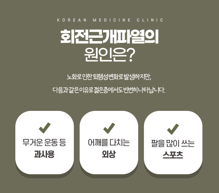 회전근개파열이란 어깨 관절을 감싸고 있는 네 개의 힘줄인 극상근, 극하근, 소원근, 견갑하근 중 하나 이상이 손상되거나 끊어지는 상태를 의미하며 이는 어깨의 안정성을 유지하고 팔을 자유롭게 움직이게 하는 핵심적인 기능에 문제가 생겼음을 뜻합니다. 어깨는 우리 몸에서 가동 범위가 가장 넓은 관절인 만큼 손상에 취약한 구조를 가지고 있는데 회전근개파열이 발생하는 주요 배경으로는 노화에 따른 퇴행성 변화가 꼽힙니다. 나이가 들면서 힘줄로 가는 혈액 공급이 줄어들고 탄력이 떨어지면서 작은 충격에도 쉽게 손상이 가해지는 것입니다. 하지만 최근에는 스포츠 활동을 즐기는 인구가 늘어남에 따라 무거운 기구를 반복적으로 들거나 어깨 위로 팔을 휘두르는 동작을 과도하게 수행하여 발생하는 사례도 빈번하기에 금천동 회전근개파열치료가 필요합니다.