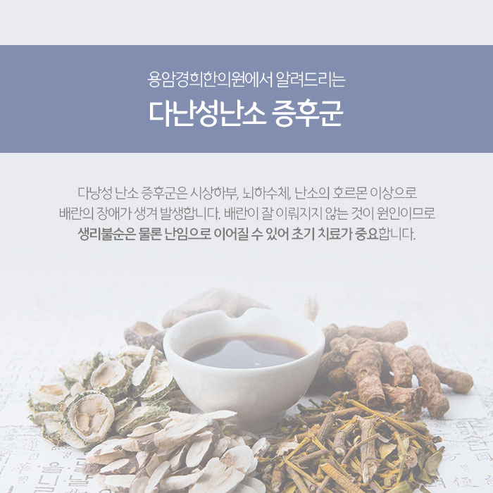 다낭성난소증후군이란 호르몬 이상으로 남성 호르몬 분비가 증가해 배란장애가 발생하는 것입니다. 즉, 배란이 잘 이뤄지지 않아 월경 불순이 발생하는 것이기 때문에 난임의 원인이 되기도 합니다. 이를 방치하면 자궁내막 증식증 및 자궁내막암이 발생할 수 있고 대사 증후군과 연관되는 질환을 유발할 수 있기 때문에 적절한 시기의 용암동토요일한의원 한방치료와 함꼐 주기적인 관리가 필요합니다.