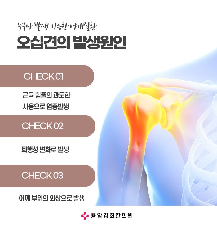 또한 팔을 위로 올리거나, 팔을 뒤로 젖힐 때 통증이 유발되며, 이로 인해 팔을 들거나 물건을 집는 등의 동작이 어려워지기 때문에 일상생활에서 큰 불편을 겪게 됩니다. 이러한 증상은 점차적으로 악화될 수 있으며, 치료 없이 방치할 경우 만성화되어 심각한 기능 제한을 초래할 수 있습니다. 오십견의 원인은 명확히 밝혀지지 않았지만, 여러 가지 요인이 복합적으로 작용하는 것으로 알려져 있다고 동남지구오십견한의원에서는 강조합니다. 첫째, 나이가 들면서 어깨 관절을 둘러싼 힘줄이나 인대가 퇴화하거나 약해지면서 발생할 수 있습니다. 나이가 많을수록 어깨의 구조적인 변화가 일어나면서, 이로 인해 어깨에 무리가 가해져 염증이 생기고, 결국 오십견이 발생하게 됩니다. 둘째, 어깨의 과도한 사용이나 반복적인 움직임도 오십견을 유발할 수 있습니다.