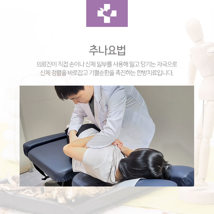 사고 충격으로 신체 정렬이 무너져 통증과 여러 증상이 나타나는 경우에는 추나요법을 적용합니다. 분평동교통사고한의원 담당 의료진이 직접 손과 신체부위 또는 소도구, 추나테이블 등을 이용해 밀고 당기는 자극으로 척추와 관절의 구조를 바로잡고 혈류순환을 촉진해 염증과 통증을 완화하는 한방치료입니다.