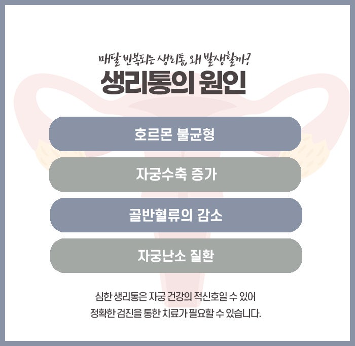자궁내막증은 자궁 안에 있어야 할 자궁내막 조직이 자궁 밖의 복강이나 난소, 인대 등에 달라붙어 증식하는 상태를 말하며 생리통은 월생 주기에 따라 아랫배와 골반 주변에 느껴지는 통증을 의미합니다. 원래 자궁내막은 임신을 준비하며 두꺼워졌다가 임신이 되지 않으면 생리혈과 함께 몸 밖으로 배출되어야 하지만 자궁외 부위로 흘러 들어간 조직들은 나갈 곳이 없어 그 자리에서 출혈과 염증을 일으키며 주변 조직과 달라붙는 유착 현상을 만듭니다. 생리통은 이러한 자궁내막증 같은 특정한 원인이 있을 때 나타나기도 하지만 특별한 이상 없이 자궁을 수축시키는 물질인 프로스타글란딘이 과도하게 분비되어 자궁 근육이 강하게 수축하면서 혈류가 줄어들어 발생하기도 하여 동남지구여성질환치료가 필요합니다.